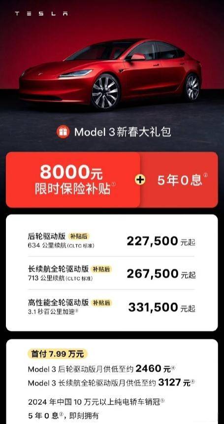 日前,特斯拉中国调养了Model 3的购车计谋:即日起至2月28日,购买指定版块可享8000元保障补贴。期间点卡在春节前后,显著是念念收拢年前换车的小岑岭。