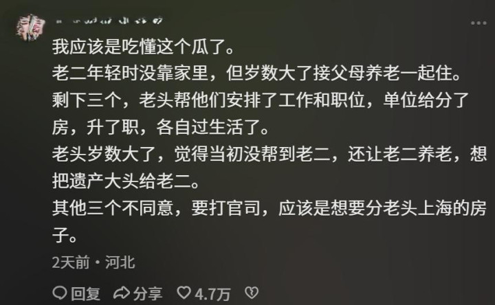 更关节的是,他和老伴早已立下遗嘱:房产归二女儿,入款则由小女儿拿40%,大哥老三各20%。在他看来,这是公正的赔偿,亦然晚年终末的心愿。